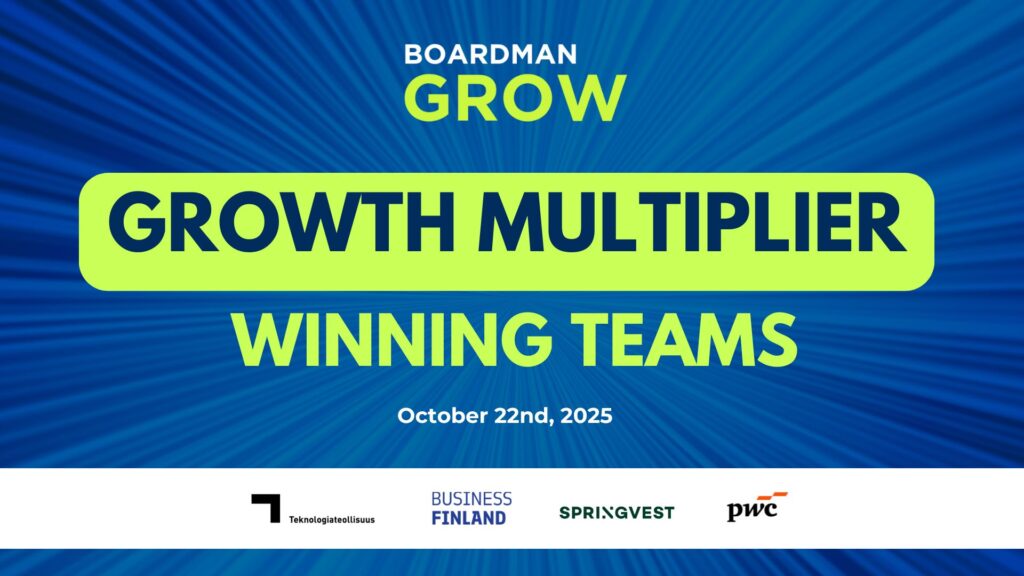 27.10.2025 – 26.11.2025, Porvoo, Haikon KartanoYrityksesi strateginen kasvu ja kilpailukyky eivät voi odottaa. Boardmanin Hallitustyöskentely-valmennus tarjoaa sinulle ja yrityksesi avainhenkilöille ratkaisevat työkalut, joilla viet kasvuyrityksen hallituksen toiminnan kohti ammattilaistasoa.