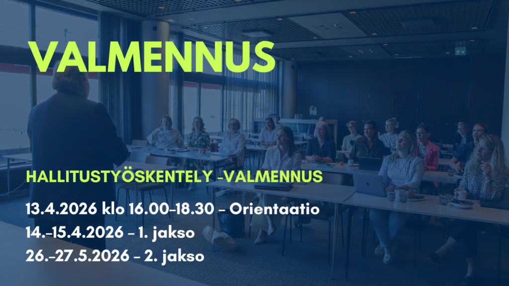 13.4.2026 – 27.5.2026, Haikon Kartano, PorvooYrityksesi strateginen kasvu ja kilpailukyky eivät voi odottaa. Boardmanin Hallitustyöskentely-valmennus tarjoaa sinulle ja yrityksesi avainhenkilöille ratkaisevat työkalut, joilla viet kasvuyrityksen hallituksen toiminnan kohti ammattilaistasoa.